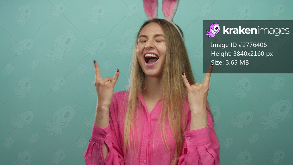 Young woman with easter bunny ears posing joyfully against an isolated green wall background, expressing happiness and fun with her hands and smile.