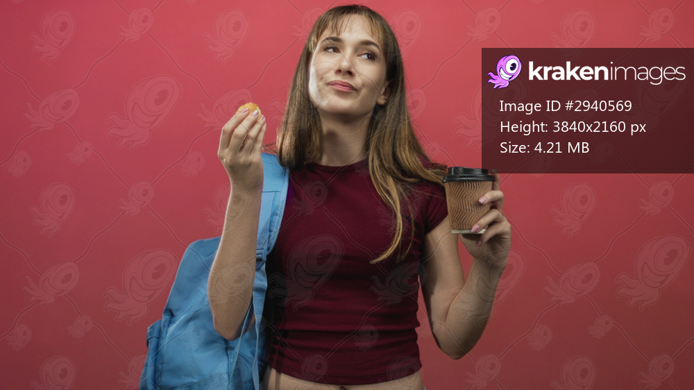 Young woman eating pastry while holding coffee and wearing a blue backpack in a red studio; contentment study break.