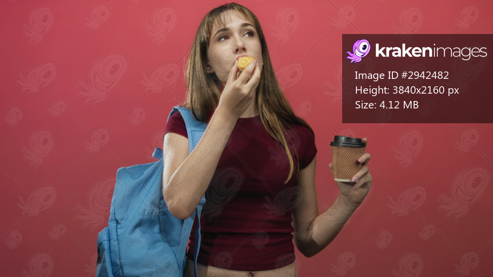 Young woman eating pastry while holding coffee and wearing a blue backpack in a red studio; contentment study break.