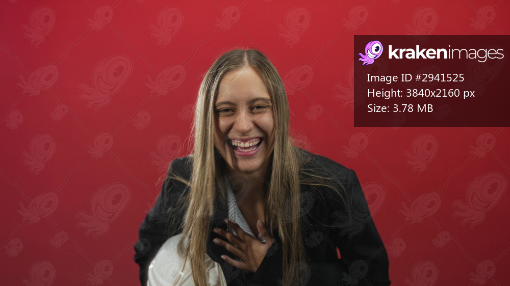 Young woman engineer holding a white hardhat and laughing with hand on chest in studio; joy empowerment.