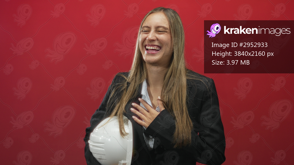 Young woman engineer holding a white hardhat and laughing with hand on chest in studio; joy empowerment.
