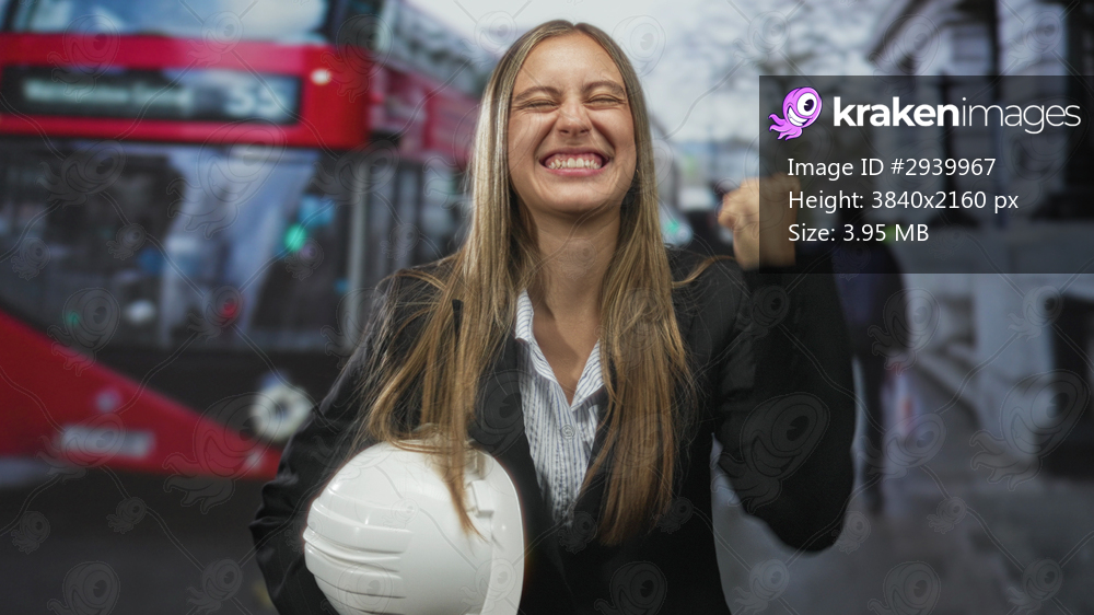 Young woman engineer holding white hardhat and smiling with fist pump on a busy urban street with a red double decker bus and stone buildings; career triumph. - Kraken Images