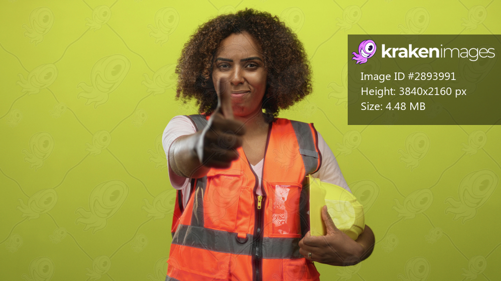 Young woman engineer in high visibility vest holding yellow hard hat and giving thumbs up in studio; confidence safety.