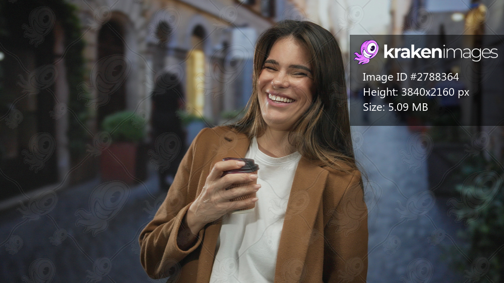 Young woman enjoying a coffee on a bustling city street, surrounded by urban ambience and vibrant life.