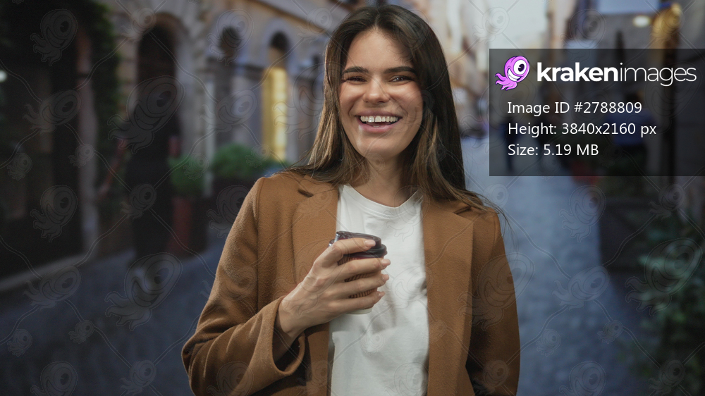 Young woman enjoying a coffee on a bustling city street, surrounded by urban ambience and vibrant life.