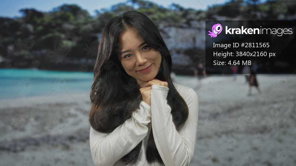 Young woman enjoying a sunny day on the beach with a serene sea and blurred figures in the background capturing a peaceful and joyful seaside moment