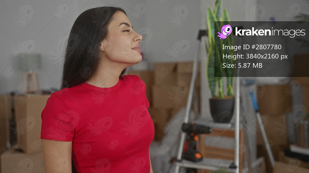 Young woman enjoying her new home surrounded by moving boxes and plants in a modern living room setting