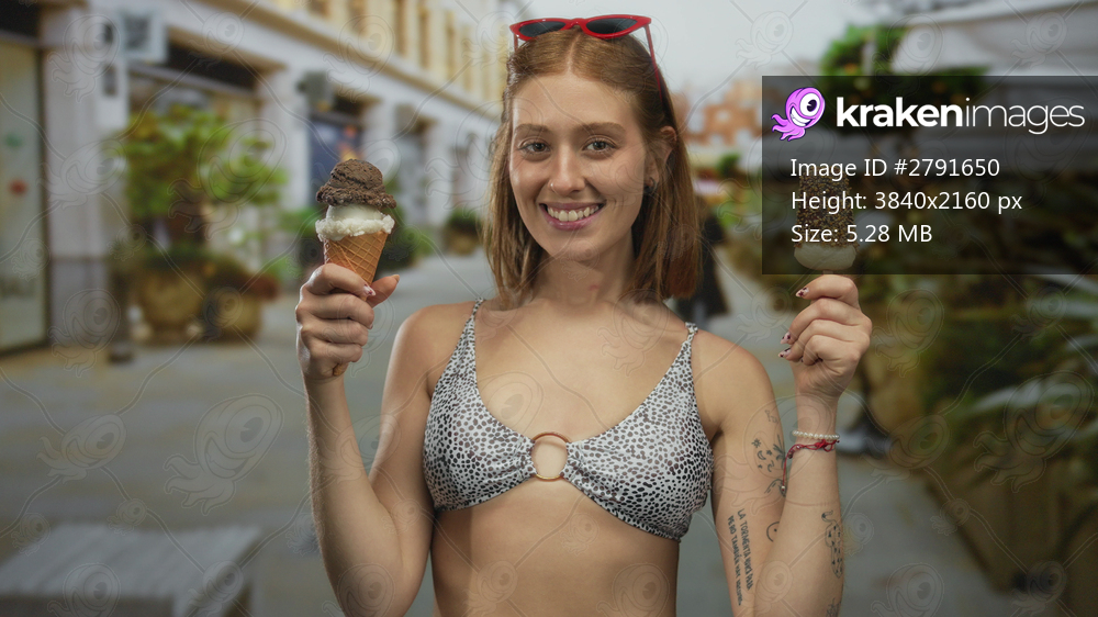 Young woman enjoying ice cream outdoors in an urban city setting wearing sunglasses and a bikini on a sunny day.