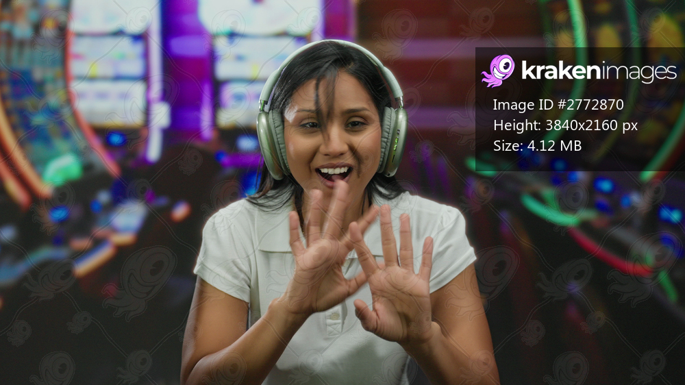 Young woman enjoying music in a casino setting with slot machines in the background, highlighting a relaxed and engaging atmosphere.