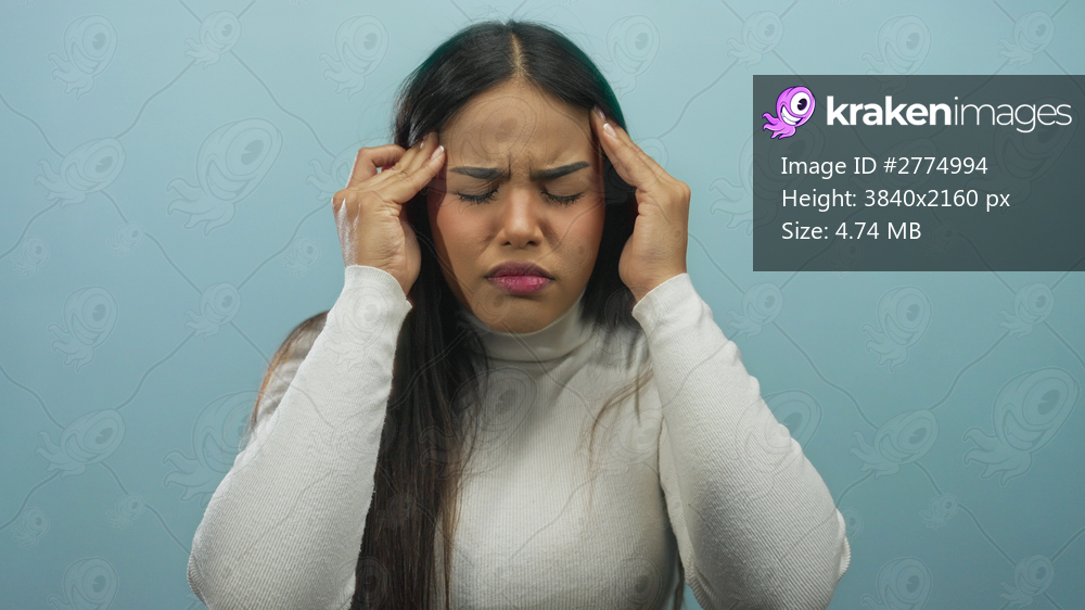 Young woman experiencing headache with hands on temples against a soft blue background, expressing discomfort and tension.