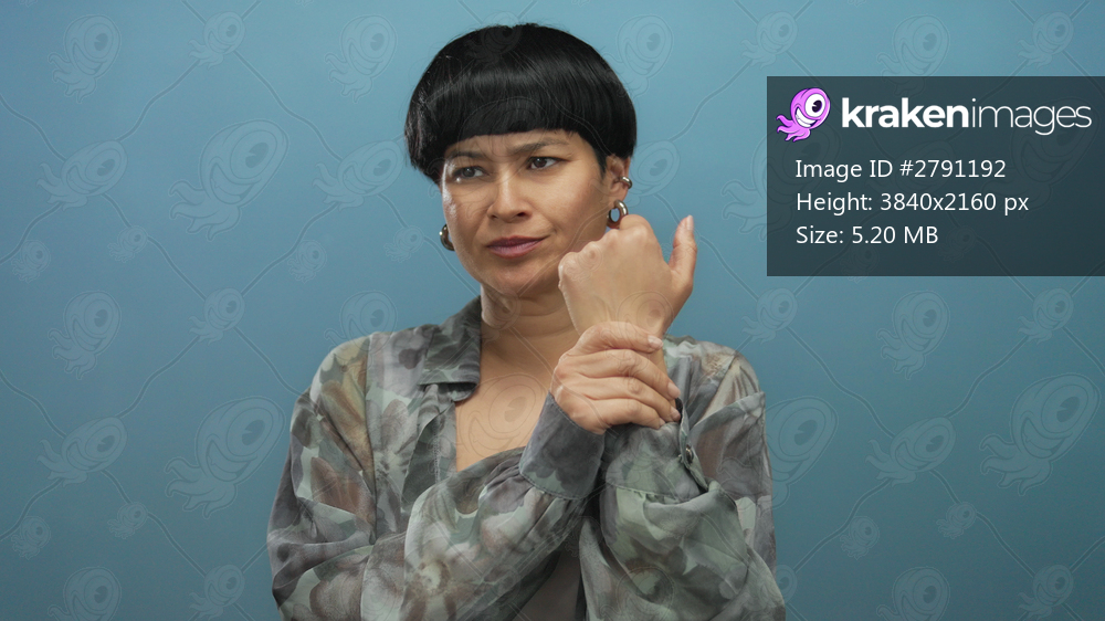 Young woman experiencing wrist pain against a blue background holds her wrist with a concerned expression emphasizing discomfort and medical condition. - Kraken Images