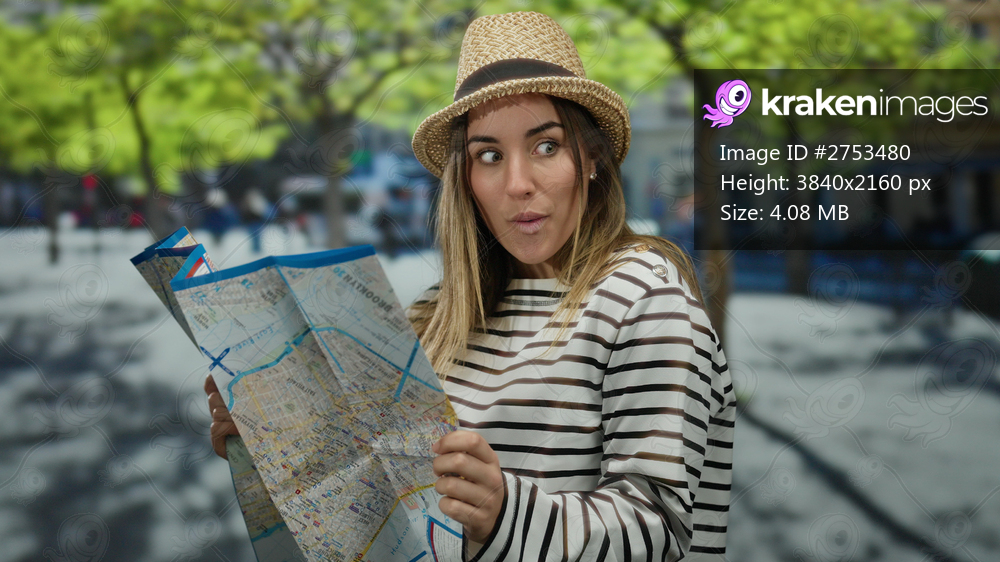 Young woman exploring city street with map outdoors wearing hat and striped shirt showcasing travel adventure and curiosity.