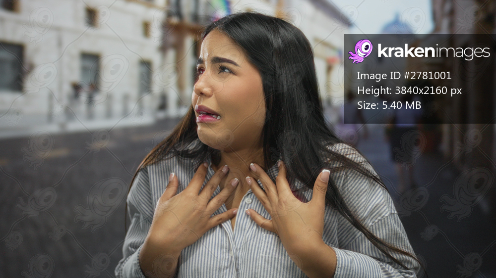 Young woman expressing emotion in a historic old town street during daytime with blurred buildings in the background, showcasing urban and cultural ambiance. - Kraken Images
