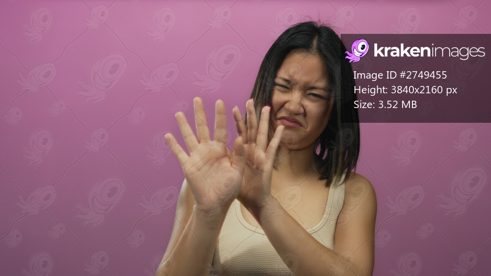 Young woman expressing rejection with her hands up against a pink background, showcasing displeasure and emotion in a minimalistic studio setting.