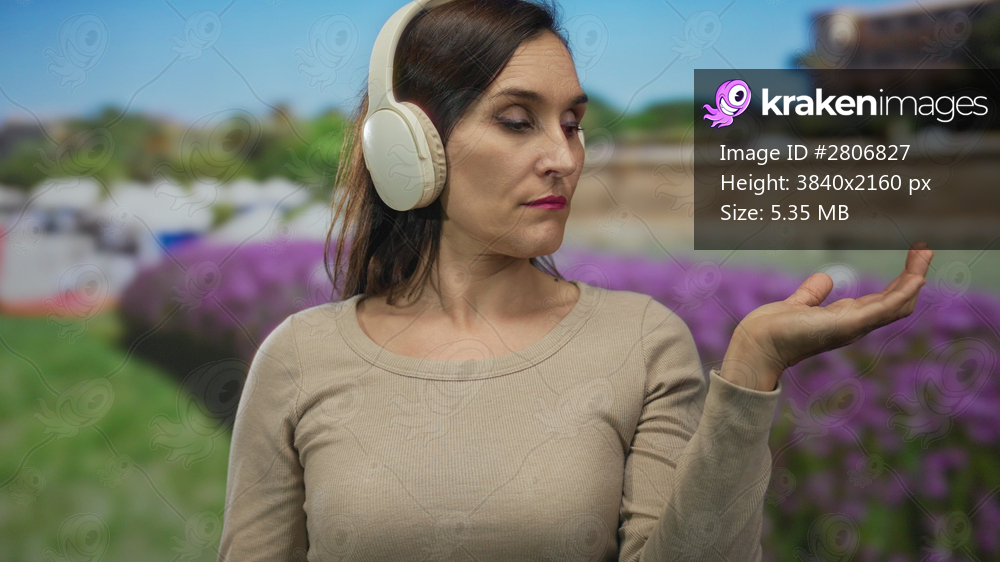 Young woman extends open hand palm up and points finger for denial at park; denial refusal skepticism.