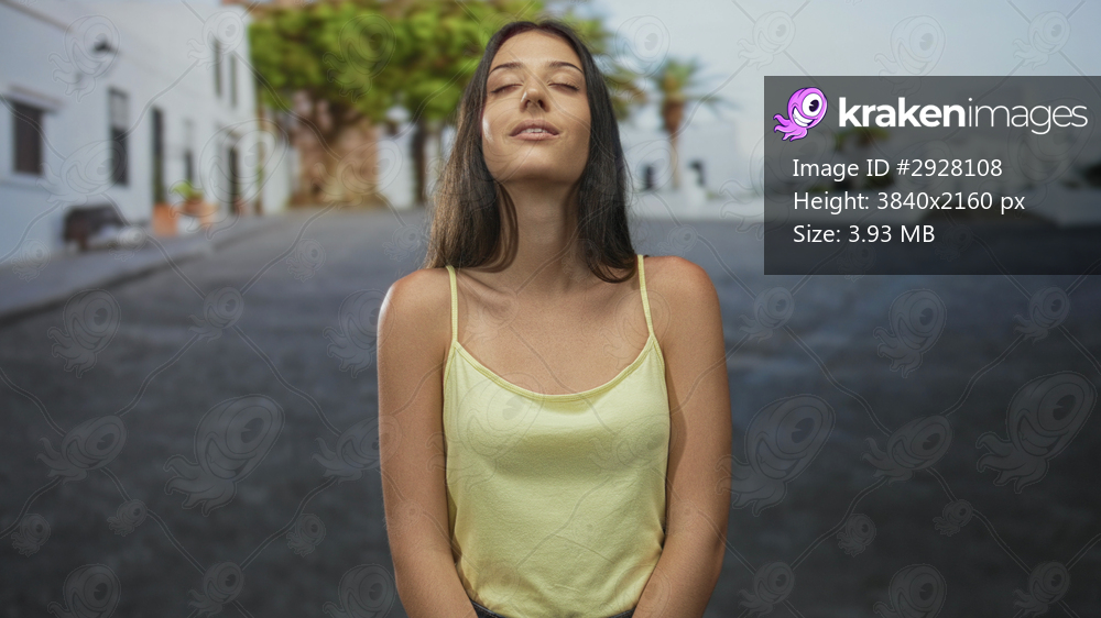 Young woman with eyes closed and a gentle smile, bare shoulders in a yellow tank top standing centered on a sunlit street lined with white buildings and palms; serenity sunlit day. - Kraken Images