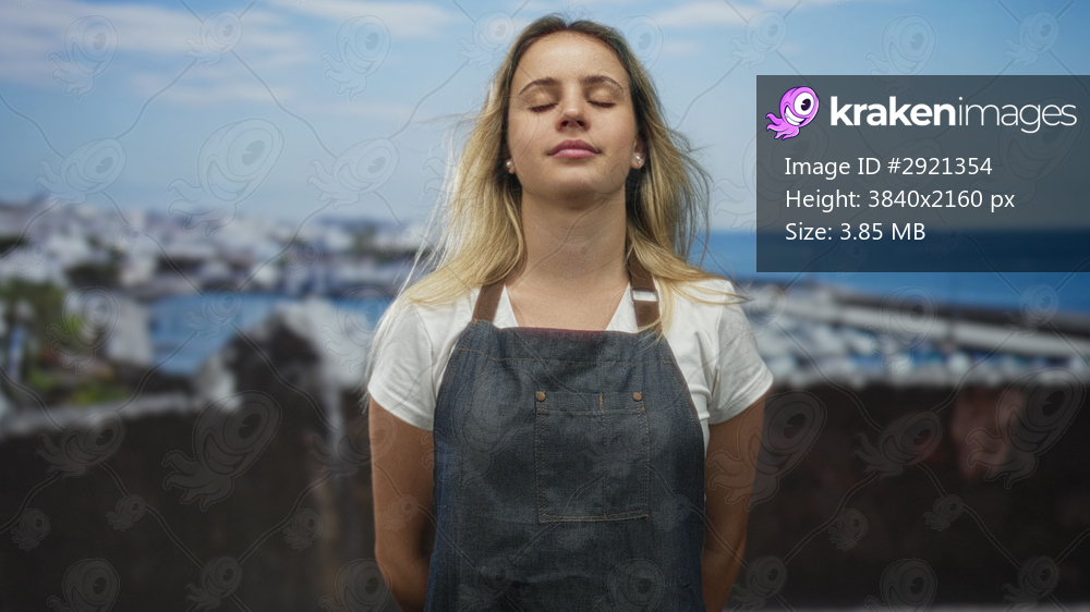 Young woman with eyes closed and bare face, wearing denim apron with hands behind her back, standing by boats at a building near the seaside; serenity reflection. - Kraken Images