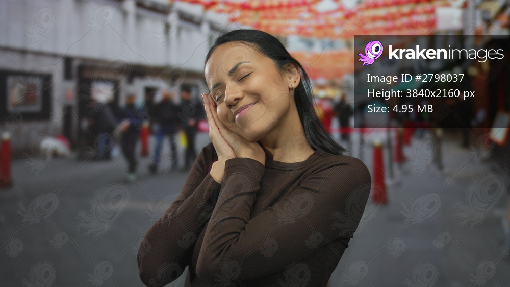 Young woman with eyes closed smiling on a bustling street with colorful banners, conveying a sense of peace and serenity in an urban outdoor setting.