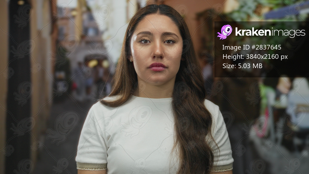 Young woman face looks forward on narrow soft sunlit street lined with cafes and stone facades; serenity.