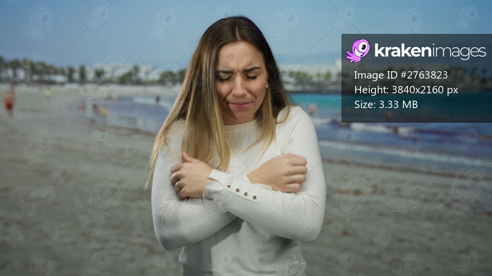 Young woman feeling cold at seaside beach scenic wet sand ocean coast wearing white sweater surrounded by blurry people water outdoor chilly atmosphere - Kraken Images