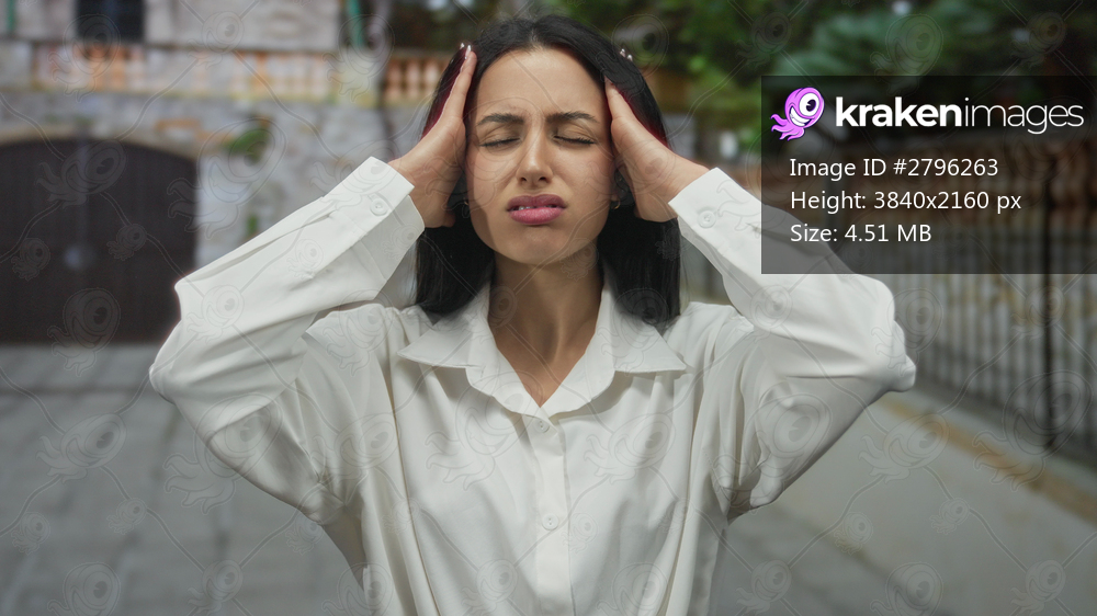 Young woman feeling stressed outdoors, holding her head with both hands, wearing a white shirt in a peaceful courtyard setting.