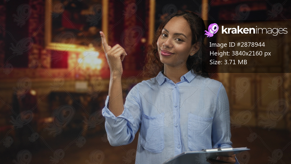 Young woman finger pointing at framed painting in museum while holding clipboard and smiling at camera; confidence guidance.