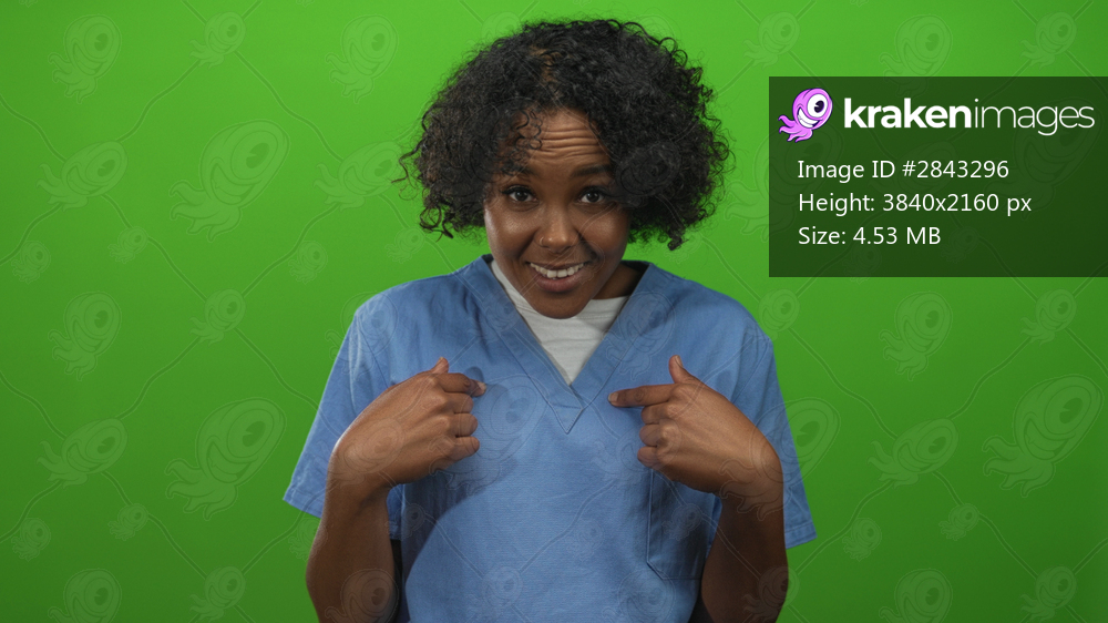 Young woman finger pointing to chest wearing blue scrubs against green screen studio wall; confidence assurance poise determination motivation inspiration. - Kraken Images