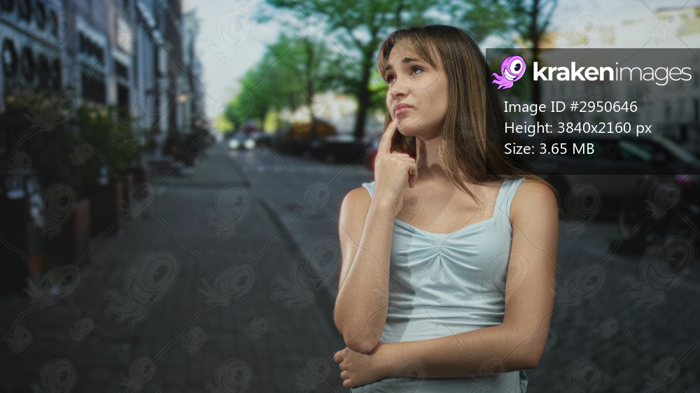 Young woman with finger to chin looking up on a cobblestone city street beside parked cars and trees; contemplation doubt.