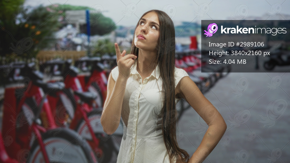 Young woman finger to chin thoughtful gesture by row of red rental bikes at street bike station; confidence.
