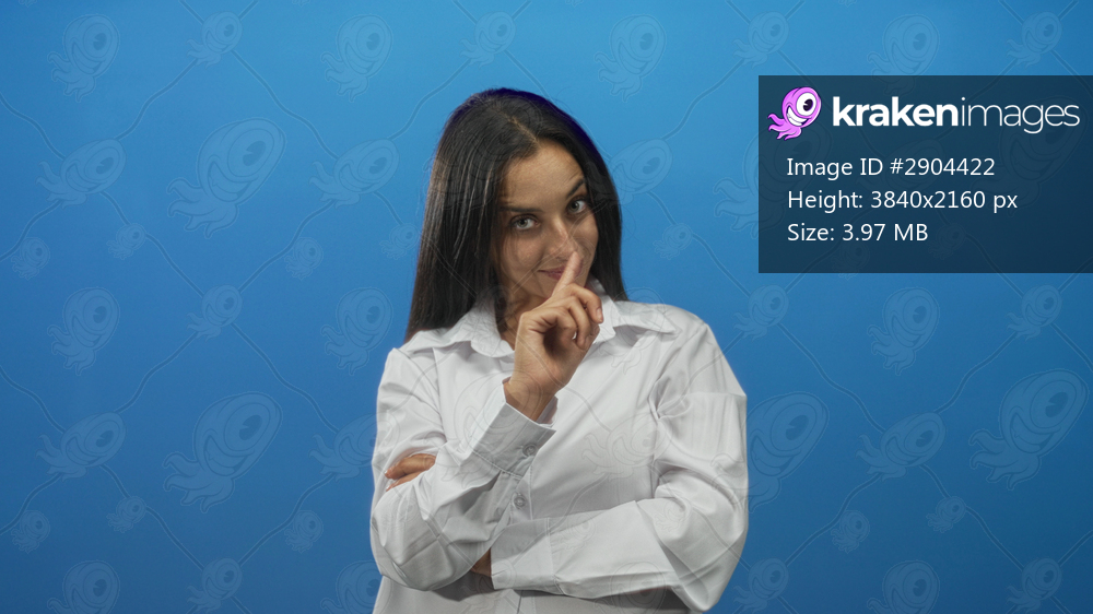 Young woman with finger to lips for silence and crossed arms in studio with blue backdrop; mischief secrecy playfulness.