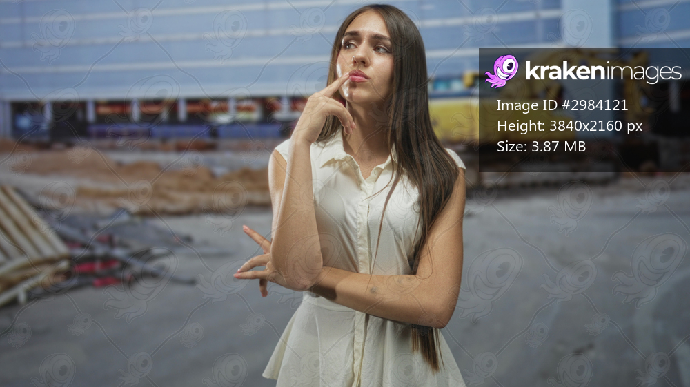 Young woman with finger to lips standing in front of excavator and construction building, wearing white dress and sleeveless pose; thoughtful uncertainty. - Kraken Images