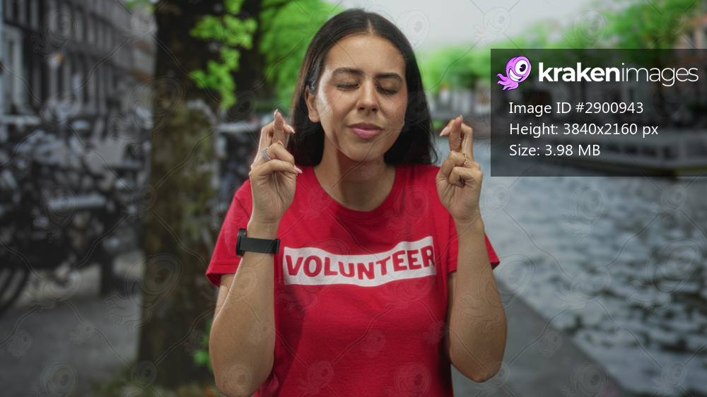 Young woman with fingers crossed on a street by a canal in amsterdam wearing a volunteer shirt; hope community support.
