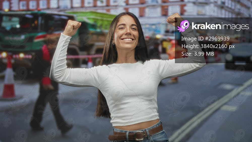 Young woman flexes arms and clenches fists while smiling on a street scene with cones and a truck; confidence empowerment.