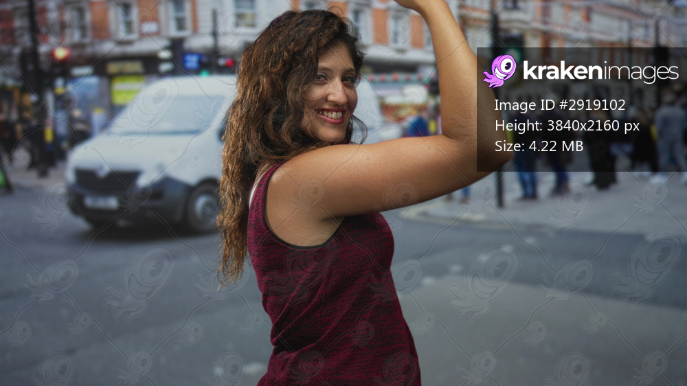 Young woman flexes bare upper arm and smiles while posing amid a busy city street with pedestrians, cars and shopfronts visible; confidence.