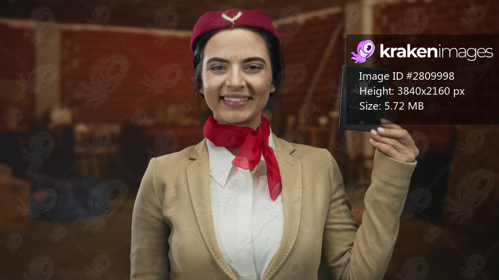 Young woman flight attendant holding australian passport in indoor construction site with a confident smile against a brick wall background showing identity and international travel. - Kraken Images