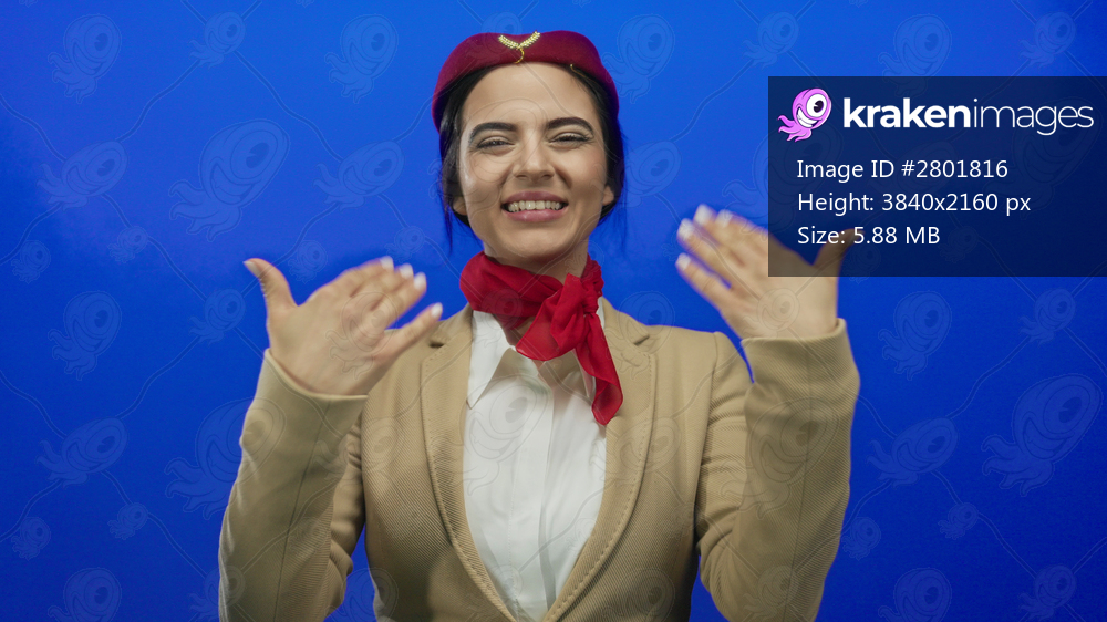 Young woman flight attendant in uniform makes inviting gesture against blue wall background expressing friendly hospitality smiles brightly