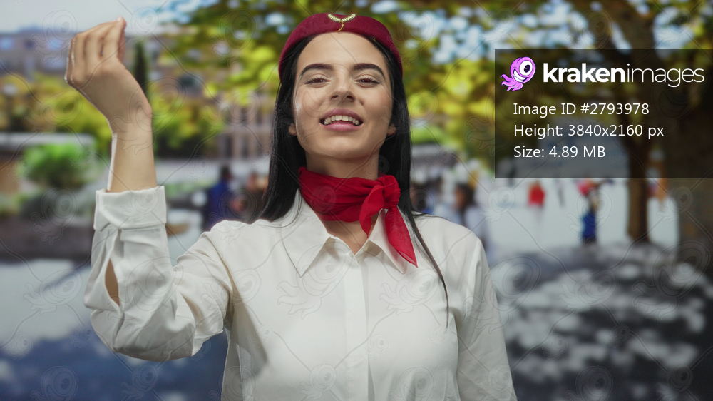 Young woman flight attendant in uniform smiling while gesturing in an outdoor street setting with trees and blurred people in the background during daytime. - Kraken Images