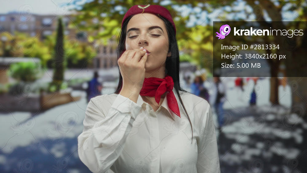 Young woman flight attendant in uniform smiling while gesturing in an outdoor street setting with trees and blurred people in the background during daytime. - Kraken Images