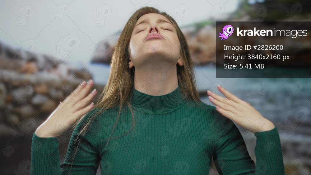 Young woman flips hair with both hands by rolling waves on sunlit beach sand around rocky outcrop; confidence freedom empowerment.