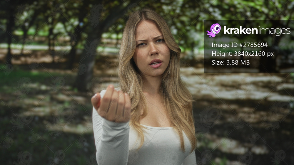 Young woman with flowing blonde hair pointing her index finger firmly at camera in a sunlit park glade; accusation frustration.
