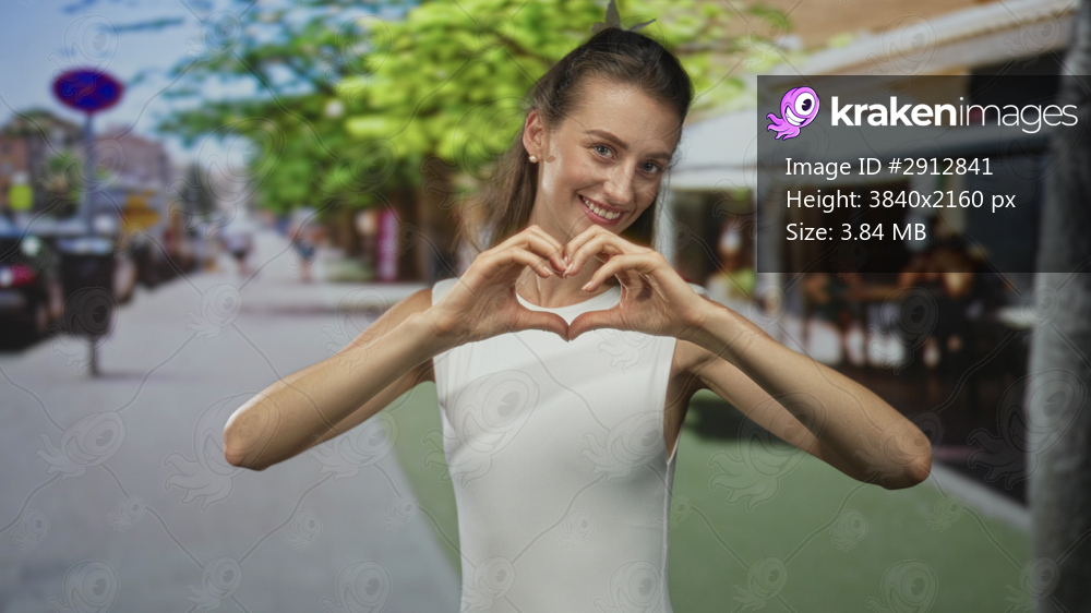Young woman forming a heart with hands on a street terrace outside cafe, smiling toward camera; love joy.