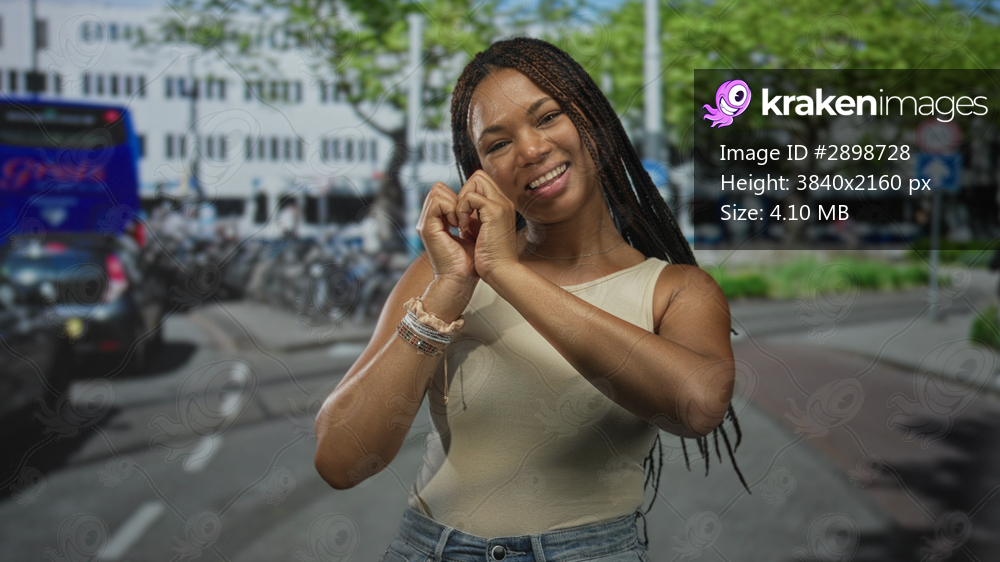 Young woman forms heart with hands while smiling on a busy city street in daylight wearing a beige tank top and jeans; gentle affection.