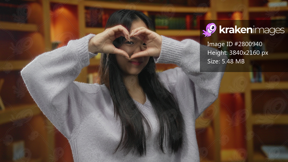 Young woman forms heart shape with hands in cozy library setting, showcasing indoor warmth and book-filled wooden shelves, embodying joy and love with a friendly smile. - Kraken Images