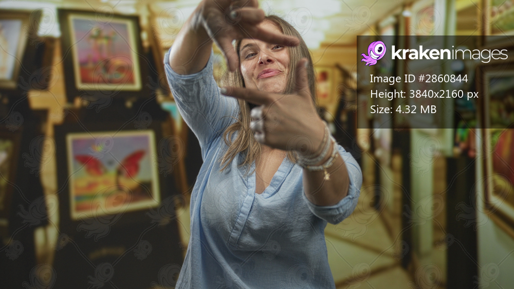 Young woman frames painting exhibit with hands forming rectangle in art gallery building; inspiration creativity imagination vision.