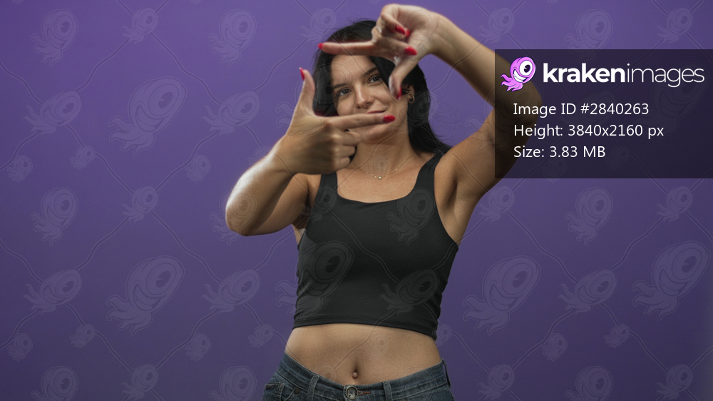 Young woman frames shot with red painted fingernails around face and midriff in studio setting with subtle smile; creativity.