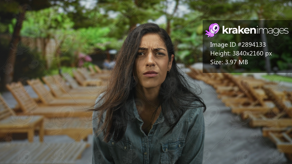 Young woman frowning with visible face and furrowed brow by pool lounge chairs outdoors in denim shirt; uncertainty concern.