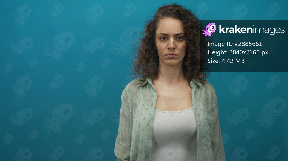 Young woman frowning with visible neckline wearing white tank top and relaxed posture standing in studio against teal backdrop; concern.