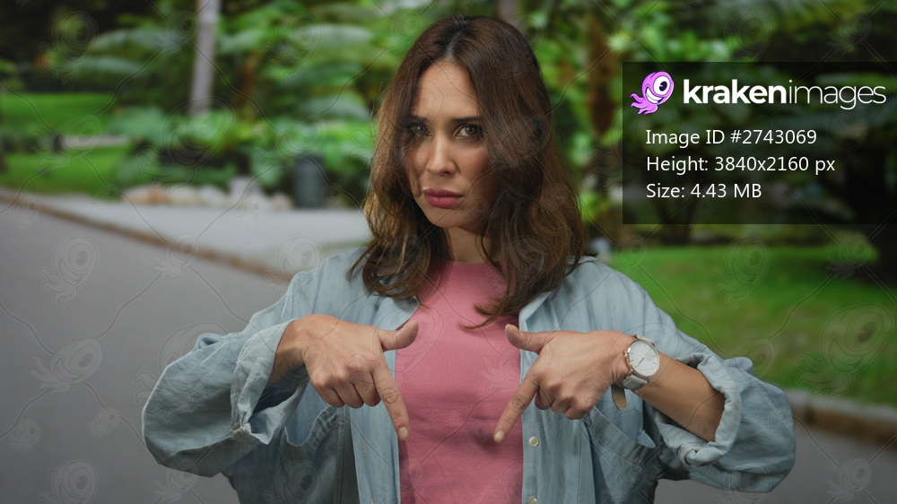 Young woman gestures with both hands in a lush park, wearing a casual shirt and a serious expression in the outdoor setting.