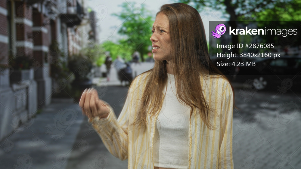 Young woman gestures with palm up and questioning face on city street; confusion everyday urban moment.