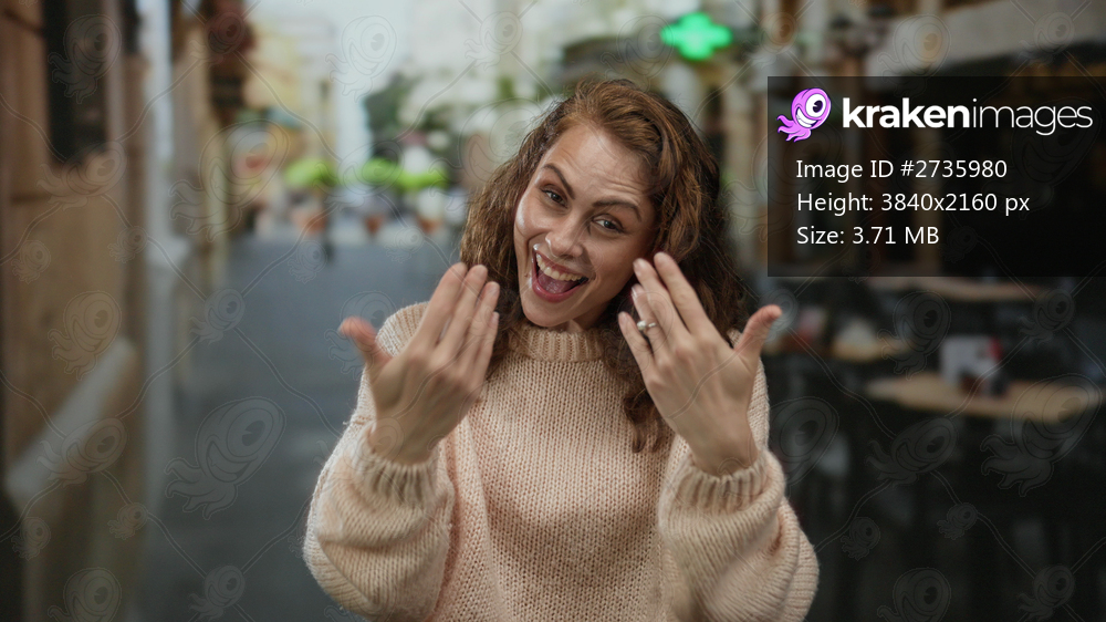 Young woman gesturing come here with hands on a city street terrace, wearing a cozy sweater, looking cheerful, and enjoying an outdoor café setting against an urban backdrop.